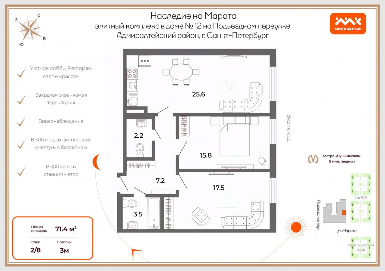 Арт. 94725993 В устье улицы Марата, ранее именуемой Преображенской, на пересечении с Подъездным переулком, в окружении скверов построен новый респектабельный комплекс апартаментов для жизни - "Наследие на Марата".