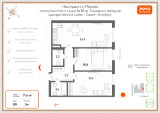 Планировка квартиры включает в себя две комнаты 17.5 и 15.8 кв. метров с окнами на сквер; два санузла и просторную кухню-гостиную 25.6 кв. метров. Высота потолков 3 м.