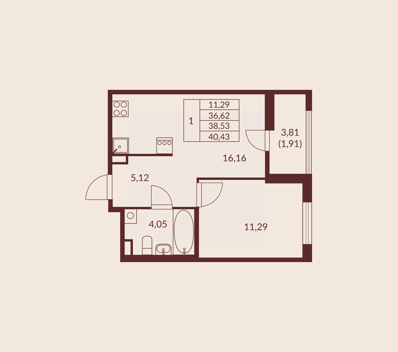 Общая площадь38,53 м²