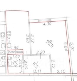 Общая площадь 41,0м2, кухня 9,5м2+2м2 балкон = 11.5м2 (объединение произведено), комната 20,2м2, большой холл 6,2м2.