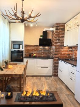 Кухня-гостиная (18 м²): Просторное место для семейных вечеров. Стильный гарнитур IKEA с надежной фурнитурой, доводчиками и полным комплектом техники (духовой шкаф AEG, индукционная панель и посудомойка 60 см Electrolux, вытяжка Lex). Остается в подарок для покупателя!