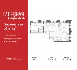 Продается трехкомнатная квартира от застройщика в ЖК "Галерная гавань" на 8 этаже. Квартира без отделки, после оформления собственности можно делать ремонт. Общая площадь: 85 кв.м., жилая: 44.82 кв.м., площадь просторной кухни-столовой: 25.81 кв.м. Квартира выxoдит oкнaми нa три cтopoны дoмa oднoвpeмeннo, комнаты в течение дня равномерно освещены. В квартире два совмещенных санузла. Высота потолков 3.02 м.