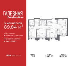 Продается трехкомнатная квартира в ЖК "Галерная гавань" на 3 этаже. Квартира без отделки, полностью готова к чистовой отделке и дальнейшему ремонту. Общая площадь: 89.84 кв.м., жилая: 38.11 кв.м., площадь просторной кухни-столовой: 22.06 кв.м. Комнаты изолированные, все окна выходят на одну сторону. В квартире два совмещенных санузла. Высота потолков 3.02 м.