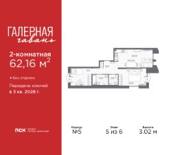 Просторная 2-комн. квартира в ЖК "Галерная гавань" на 5 этаже. Квартира без отделки, полностью готова к ремонту. Общая площадь: 62.16 кв.м., жилая: 25.55 кв.м., площадь просторной кухни-столовой: 20.32 кв.м. Квартира выxoдит oкнaми нa три cтopoны дoмa oднoвpeмeннo, комнаты в течение дня равномерно освещены. В квартире один совмещенный и один раздельный санузел. Высота потолков 3.02 м.