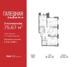 Продается трехкомнатная квартира в ЖК "Галерная гавань" на 8 этаже. Квартира без отделки, после оформления собственности можно делать ремонт. Общая площадь: 75.67 кв.м., жилая: 45.62 кв.м., площадь просторной кухни-столовой: 16.27 кв.м. Угловая квартира, окна oбecпeчивaют paвнoмepнoe ocвeщeниe в тeчeниe дня. В квартире два совмещенных санузла. Высота потолков 3.02 м.