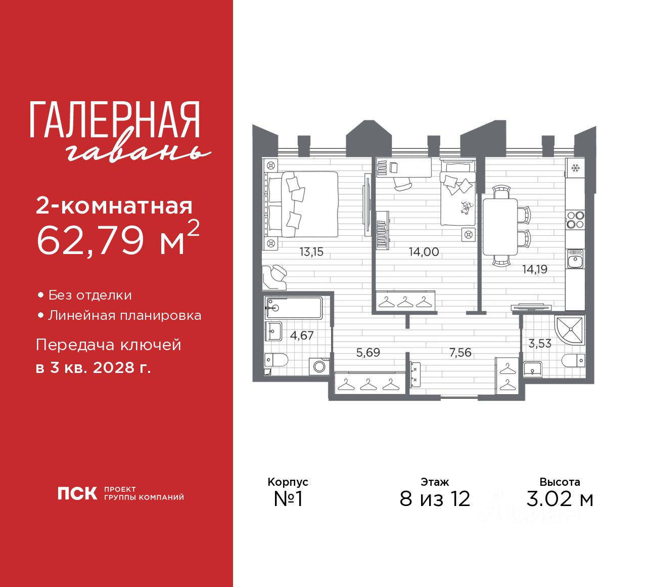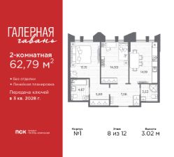 Продается 2-комн. квартира от застройщика в ЖК "Галерная гавань" на 8 этаже. Квартира без отделки, полностью готова к чистовой отделке и дальнейшему ремонту. Общая площадь: 62.79 кв.м., жилая: 27.15 кв.м., площадь просторной кухни-столовой: 14.19 кв.м. Комнаты изолированные, все окна выходят на одну сторону. В квартире два совмещенных санузла. Высота потолков 3.02 м.
