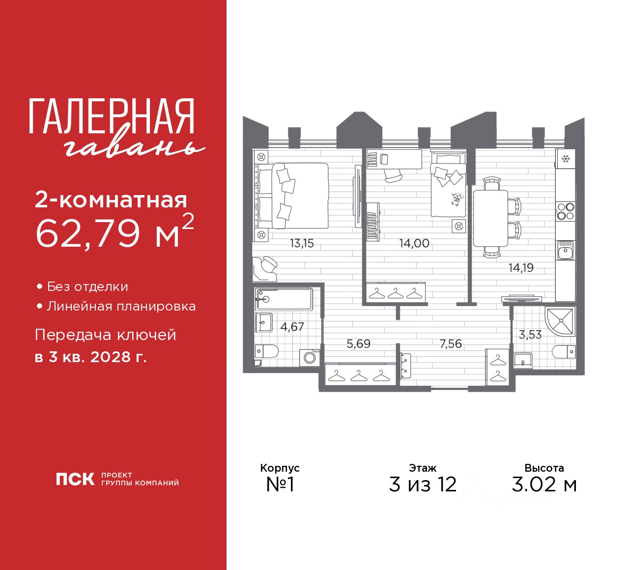 Продается двухкомнатная квартира в ЖК "Галерная гавань" на 3 этаже. Квартира без отделки, после выдачи ключей можно делать ремонт. Общая площадь: 62.79 кв.м., жилая: 27.15 кв.м., площадь просторной кухни-столовой: 14.19 кв.м. Комнаты изолированные, все окна выходят на одну сторону. В квартире два совмещенных санузла. Высота потолков 3.02 м.