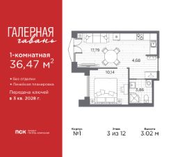 Продается 1-комн. квартира в ЖК "Галерная гавань" на 3 этаже. Квартира без отделки, новый владелец может сделать ремонт по своему проекту. Общая площадь: 36.47 кв.м., жилая: 10.14 кв.м., площадь просторной кухни-столовой: 17.79 кв.м. Все окна выходят на одну сторону. В квартире один совмещенный санузел. Высота потолков 3.02 м.