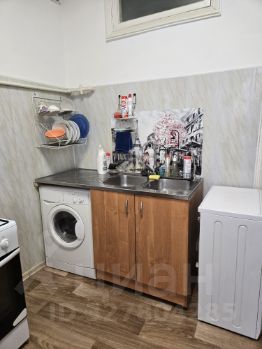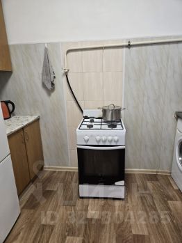Кухня 9,8 метров с газовой плитой. На кухне стол с навесным шкафчиком, холодильник и стиральная машина-автомат, которые относятся к этой комнате.