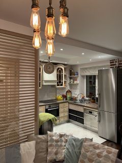 За счет небольшого переноса внутренних перегородок сделали очень комфортную кухню-гостиную, где удобно расположиться даже с большим количеством гостей.