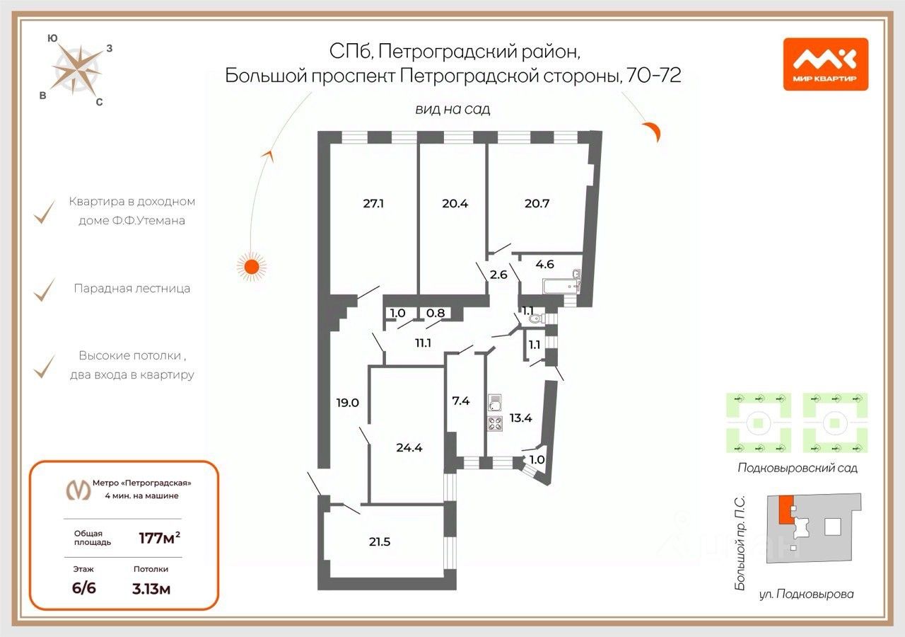 Представьте себе, как вы просыпаетесь под звуки города, наслаждаясь утренним кофе с видом на величественный Большой проспект и зелень уютного сквера, в котором весной зацветает сакура. Эта уникальная 5-комнатная квартира — не просто жилье, а настоящий оазис в центре культурной столицы России.