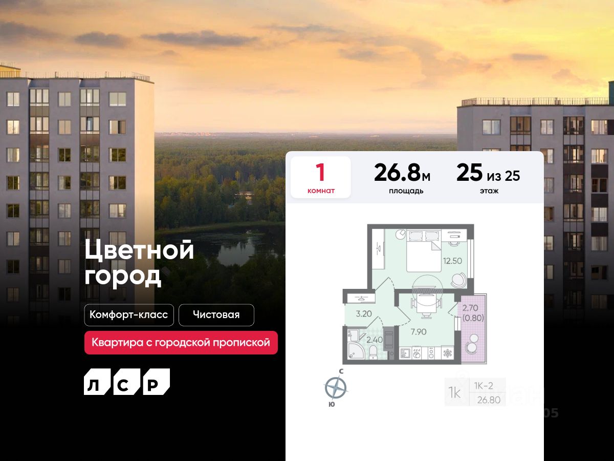 Продается 1-комнатная квартира в ЖК "Цветной город" на 25 этаже. Общая площадь составляет 26.80 кв. м. Квартира с чистовой отделкой Срок сдачи дома: 3 квартал 2026. Жилой комплекс "Цветной город" располагается по адресу Санкт-Петербург, Красногвардейский.