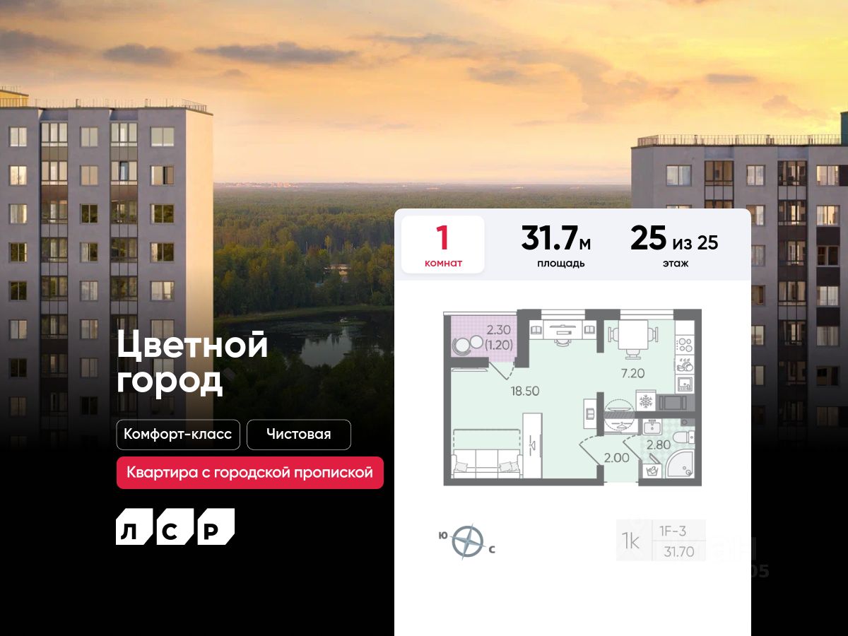 Продается 1-комнатная квартира в ЖК "Цветной город" на 25 этаже. Общая площадь составляет 31.70 кв. м. Квартира с чистовой отделкой Срок сдачи дома: 3 квартал 2026. Жилой комплекс "Цветной город" располагается по адресу Санкт-Петербург, Красногвардейский.