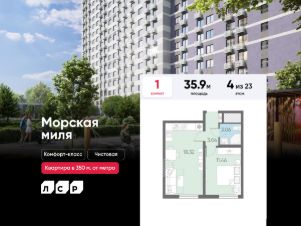 Продается 1-комнатная квартира в ЖК "Морская миля" на 4 этаже. Общая площадь составляет 35.90 кв. м. Квартира с чистовой отделкой. Жилой комплекс "Морская миля" располагается по адресу Санкт-Петербург, Красносельский.