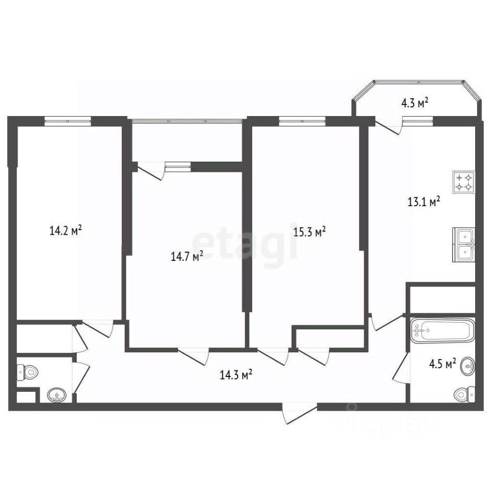 Общая площадь составляет 79,4 м2, в нее не включены балкон(3,4м2) и лоджия(2,4).