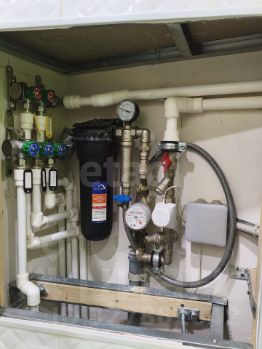 Большая ванна, инсталяция, раковина со шкафчиками и дополнительные шкафы для хранения. Установлен теплый пол. Оборудованы выходы под стиральную машинку. Выполнена качественная разводка сантехники с использованием магистральных фильтров, установлены проточный водонагреватель на 6,5 кВт и система защиты от протечек.