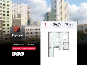 Продаётся 1-комнатная квартира в ЖК "Ручьи" на 17 этаже. Общая площадь составляет 34.70 кв. м. Квартира с чистовой отделкой. Жилой комплекс "Ручьи" располагается по адресу Санкт-Петербург, Красногвардейский.