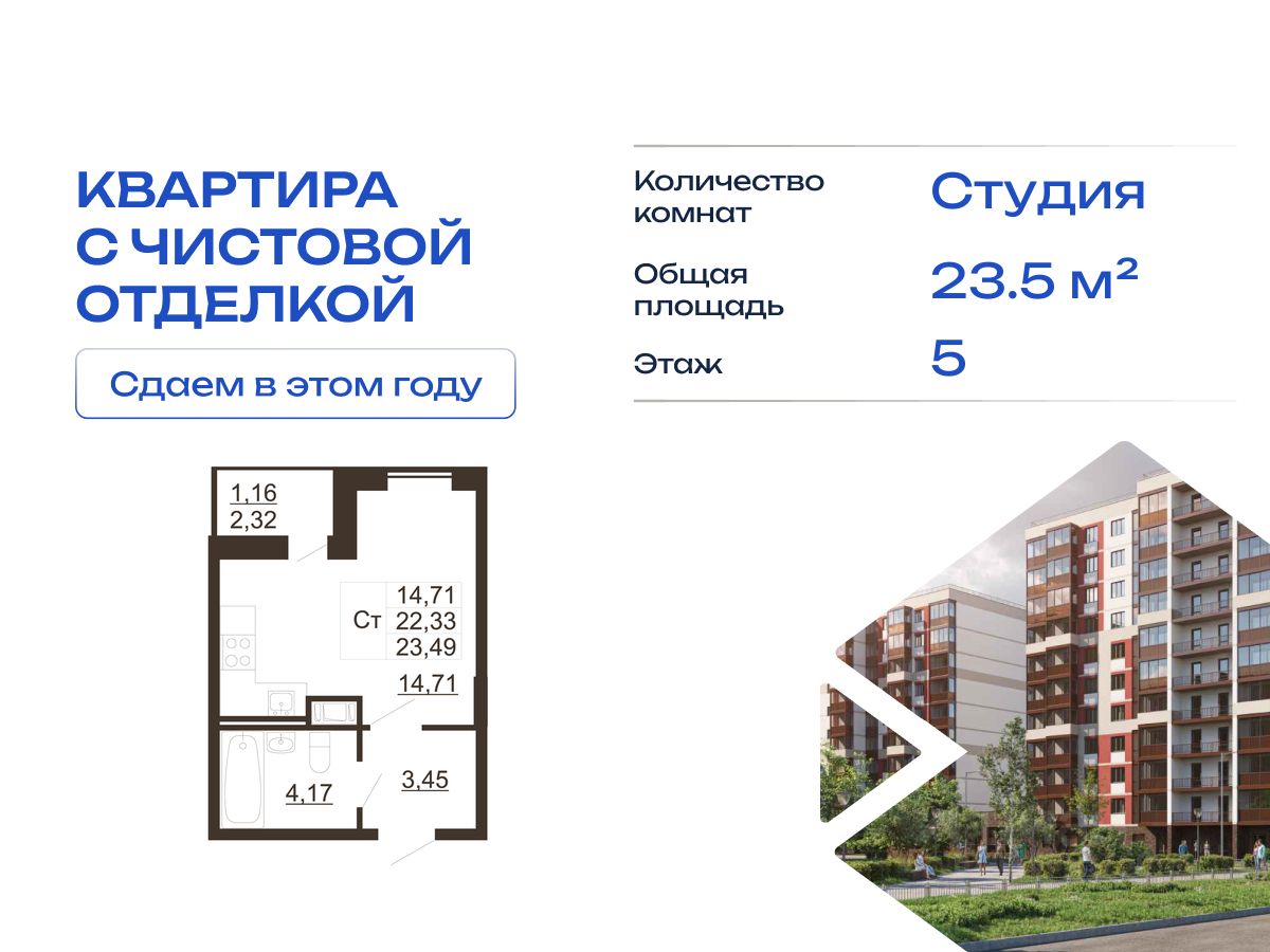 Продается квартира студия в жилом комплексе "Рубеж" от ГК СТОУН нa 5 этаже. Общaя площадь cоcтaвляeт 23.49 кв. м.