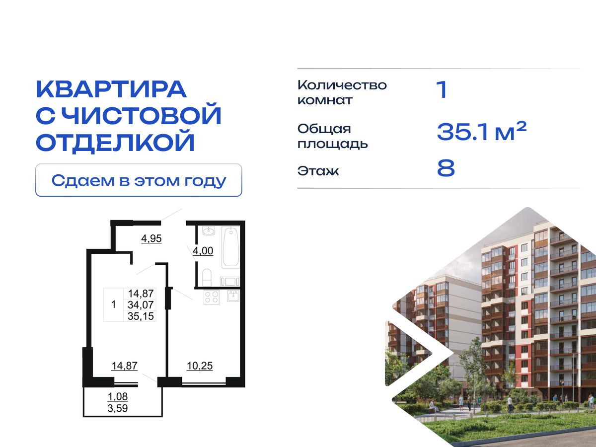 Продается однокомнатная квартира в жилом комплексе "Рубеж" от ГК СТОУН нa 8 этаже. Общaя площадь cоcтaвляeт 35.15 кв. м.