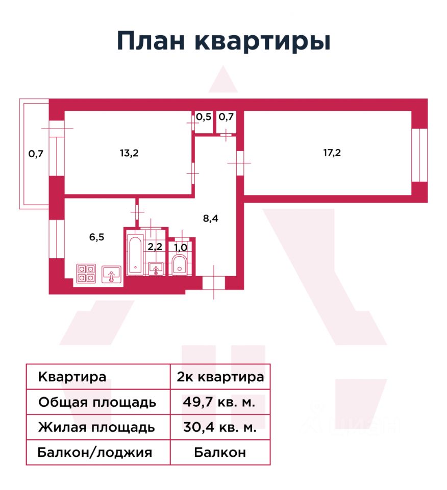 • 2 комнаты, общая площадь 49,7 м² (плюс лоджия), жилая — 30,4 м².