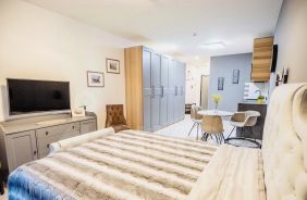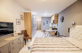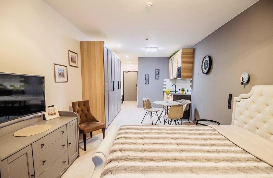 В квартире сделан современный евроремонт, который подчеркивает стиль и комфорт. Просторная студия идеально подходит для создания уютного интерьера. Санузел совмещенный, выполнен в светлых тонах. Окна выходят на улицу, обеспечивая хорошее естественное освещение.