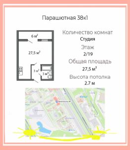Студия расположена на комфортном 2-м этаже из 19 в монолитном доме 2018 года постройки. В доме есть подземный паркинг, рядом — два шестиэтажных наземных паркинга, а также большая бесплатная парковка у дома, где всегда есть места. В парадной имеются комнаты для чистки обуви и лап животных после прогулки, а также места для временного хранения велосипедов и колясок. Парадная имеет выход на две стороны, на улицу и во двор.