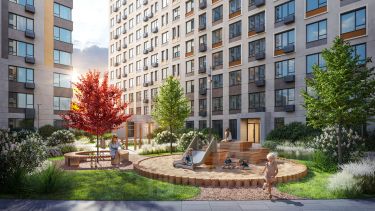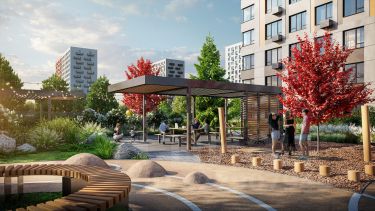 Приватное пространство внутреннего двора с беседками с розетками для работы и отдыха, зеленый двор с уютным многоуровневым освещением, детскими эко-площадками и спортивными площадками создает неповторимую атмосферу, заряжающую энергией на новые свершения.