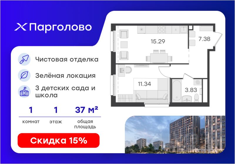 Продается 1-комн. квартира на 1-м этаже в проекте комфорт-класса Парголово. Общая площадь лота составляет 37,84 кв. м, из которых 11,34 кв. м отведено под жилую и 15,29 кв. м под кухонную зону. Номер квартиры - 8.
