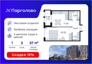 Продается 1-комн. квартира на 2-м этаже в проекте комфорт-класса Парголово. Общая площадь лота составляет 37,50 кв. м, из которых 14,25 кв. м отведено под жилую и 11,25 кв. м под кухонную зону. Номер квартиры - 161.