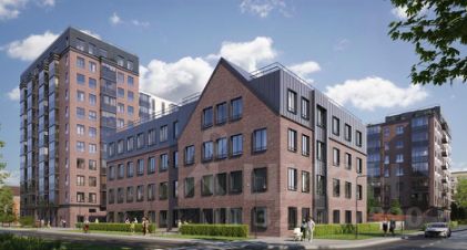 Одной из отличительных черт проекта стал четырёхэтажный объём с двускатной кровлей на юго восточном углу участка. В нём разместится современное поликлиническое отделение — это решение подчёркивает внимание к потребностям жителей уже на этапе планировки.
