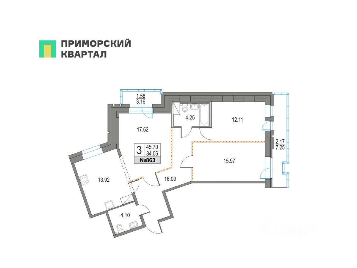 Продается 3 - комнатная квартира общей площадью 84.06 кв.м., на 15 этаже в построенном и заселенном корпусе 41 (год сдачи: 2024 г.)