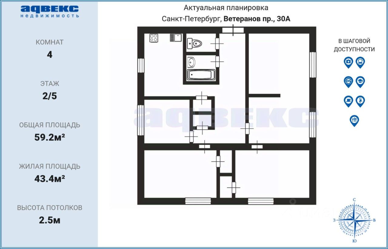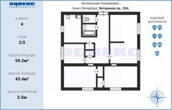 4-к. квартира, 2 этаж, 59,2 м, пр. Ветеранов, д.30.