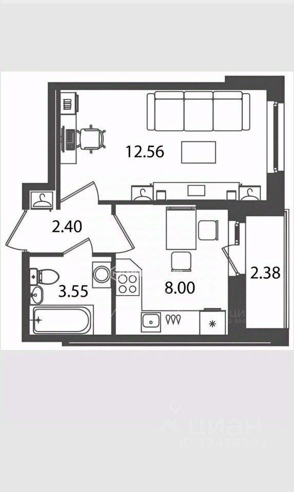 - Площадь комнаты 12.56 кВ. м., по мебели есть диван, шкафы.
