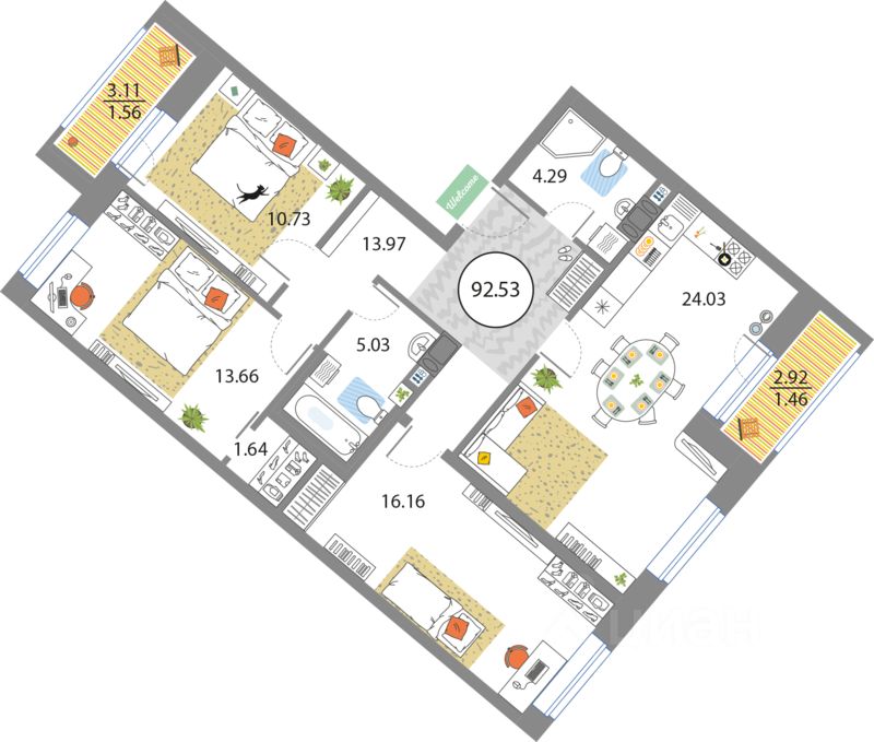 Продаётся 4-комнатная квартира в сданном доме (Дом 54 (Корпус 2)), срок сдачи: III-кв. 2022, общей площадью 92.53 кв.м., на 8 этаже. О квартале