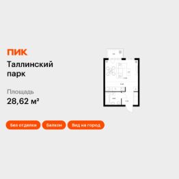 Продаётся квартира-студия площадью 28,62 кв.м на 3 этаже 12 этажного дома (Корпус 4.2, Секция 1) проекта ПИК Таллинский парк. Светлый просторный подъезд на уровне земли, функциональная планировка, большие окна, без отделки.