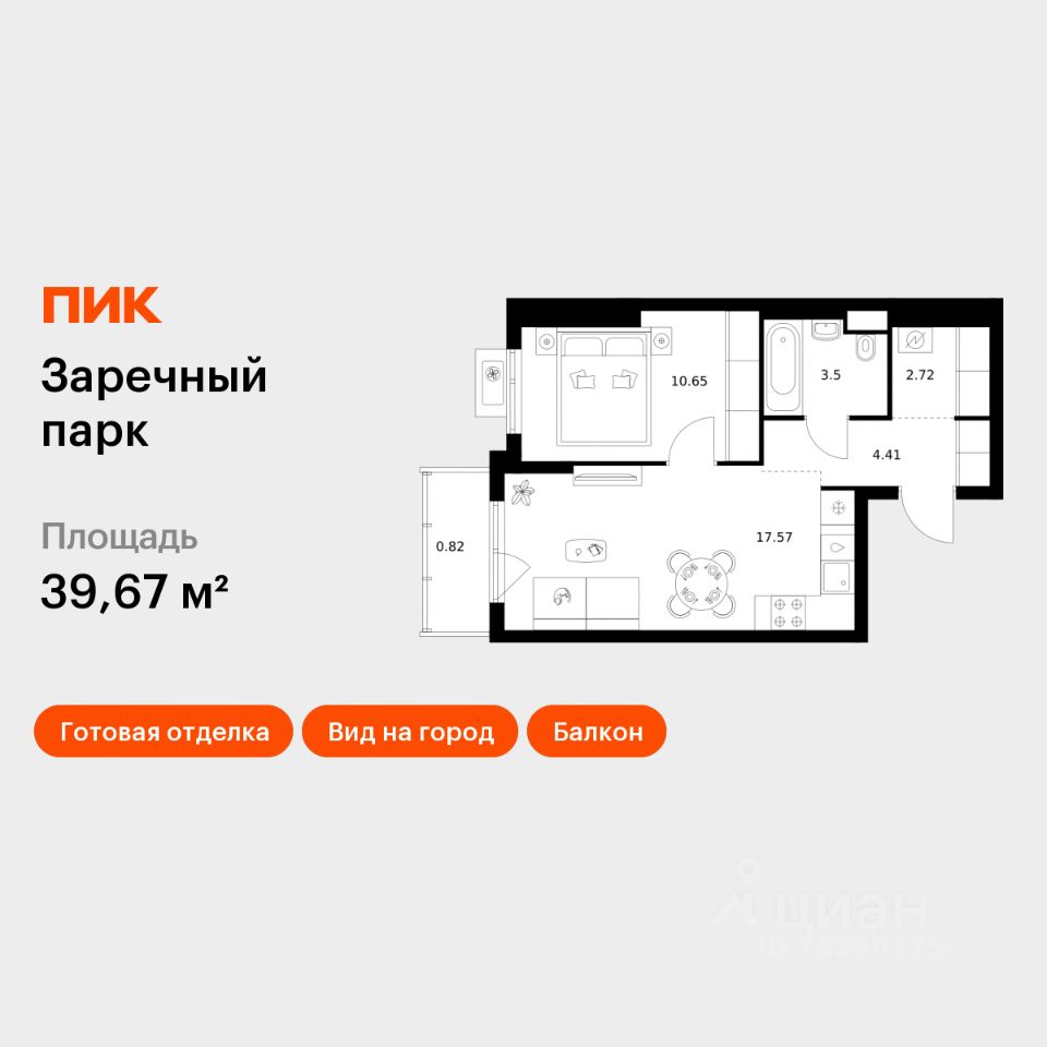 Продаётся 1-комн. квартира площадью 39,67 кв.м на 17 этаже 17 этажного дома (Корпус 4, Секция 1) проекта ПИК Заречный парк. Светлый просторный подъезд на уровне земли, функциональная планировка, большие окна, c отделкой.