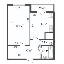 Продуманное пространство (кухня-гостиная 11 м², комната 18 м² с зонированием на спальню и гостиную).