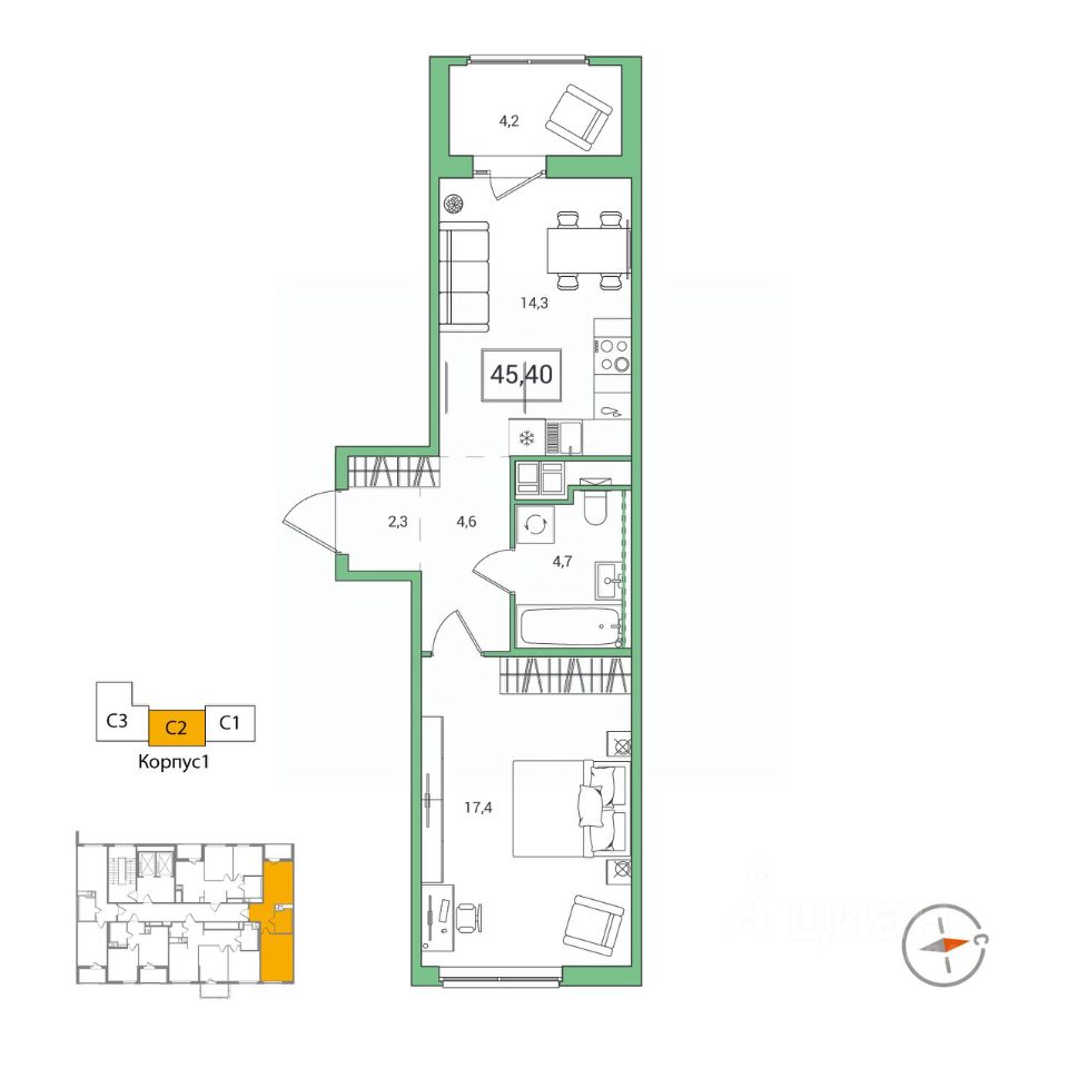 Продаётся 1-комнатная квартира в строящемся доме (Корпус 1), срок сдачи: IV-кв. 2026, общей площадью 45.4 кв.м., на 10 этаже. Новый жилой комплекс "Янила Форест" от застройщика "Ленстройтрест" расположен по адресу: Россия, Ленинградская область, Всеволожский район, Заневское городское поселение, городской посёлок Янино-1, Голландская улица