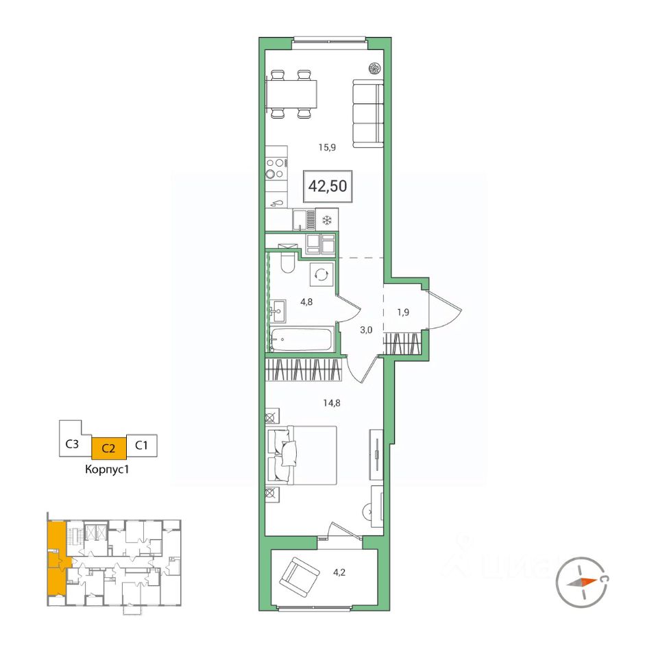 Продаётся 1-комнатная квартира в строящемся доме (Корпус 1), срок сдачи: IV-кв. 2026, общей площадью 42.5 кв.м., на 10 этаже. Новый жилой комплекс "Янила Форест" от застройщика "Ленстройтрест" расположен по адресу: Россия, Ленинградская область, Всеволожский район, Заневское городское поселение, городской посёлок Янино-1, Голландская улица