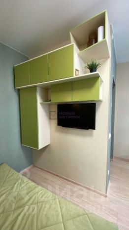 Эта квартира выделяется нестандартной планировкой, которая позволяет удобно зонировать кухонную и спальную зоны. Два больших окна наполняют помещение светом и создают атмосферу уюта. Для вашего удобства предусмотрены различные решения для хранения: встроенный шкаф, настенная консоль с полками для телевизора и компактная прихожая.