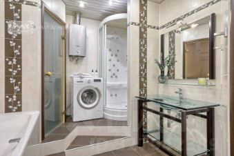 - Релакс и порядок. Ванная комната здесь приобретает статус Wellness-зоны: душевая кабина, глубокая ванна и финская сауна. Это не просто санузел, а место для перезагрузки.