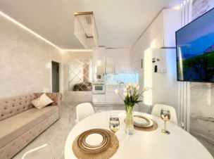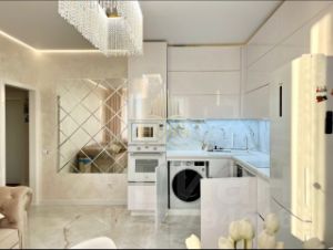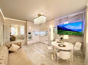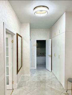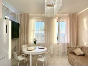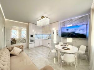 Квартира площадью 64,7 м² отличается простором и светлой атмосферой. В ней есть большая кухня-гостиная и уютные комнаты. В квартире выполнен качественный ремонт: стены покрыты венецианской штукатуркой, установлены итальянские двери и фурнитура. На полу в ванной, коридоре и кухне-гостиной уложена плитка керамогранит с подогревом. Квартира полностью меблирована и оснащена всей необходимой бытовой техникой для комфортного проживания.