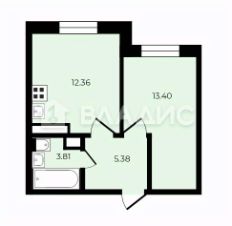 Жилая площадь составляет 13,4 кв. м, а кухня — 12,36 кв. м, что идеально подойдёт для комфортного проживания одного человека или молодой пары.