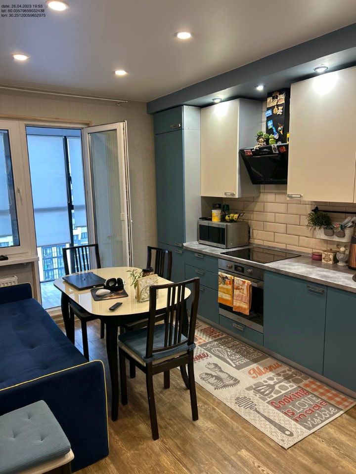 Кухня-гостиная (11,52 м²) (смотрите фото): Это стильное и функциональное пространство. Выполнен качественный ремонт: подвесной потолок со встроенным освещением, современный ламинат. Установлен стильный кухонный гарнитур в благородных сине-серых и белых тонах с столешницей под камень. В стоимость входит ВСЯ встраиваемая и отдельно стоящая бытовая техника: индукционная варочная панель, духовой шкаф, вытяжка, посудомойка,стиральная машина,микроволновая печь. Также остается вся обеденная группа (стол и стулья), а также комфортабельный синий диван в зоне отдыха.