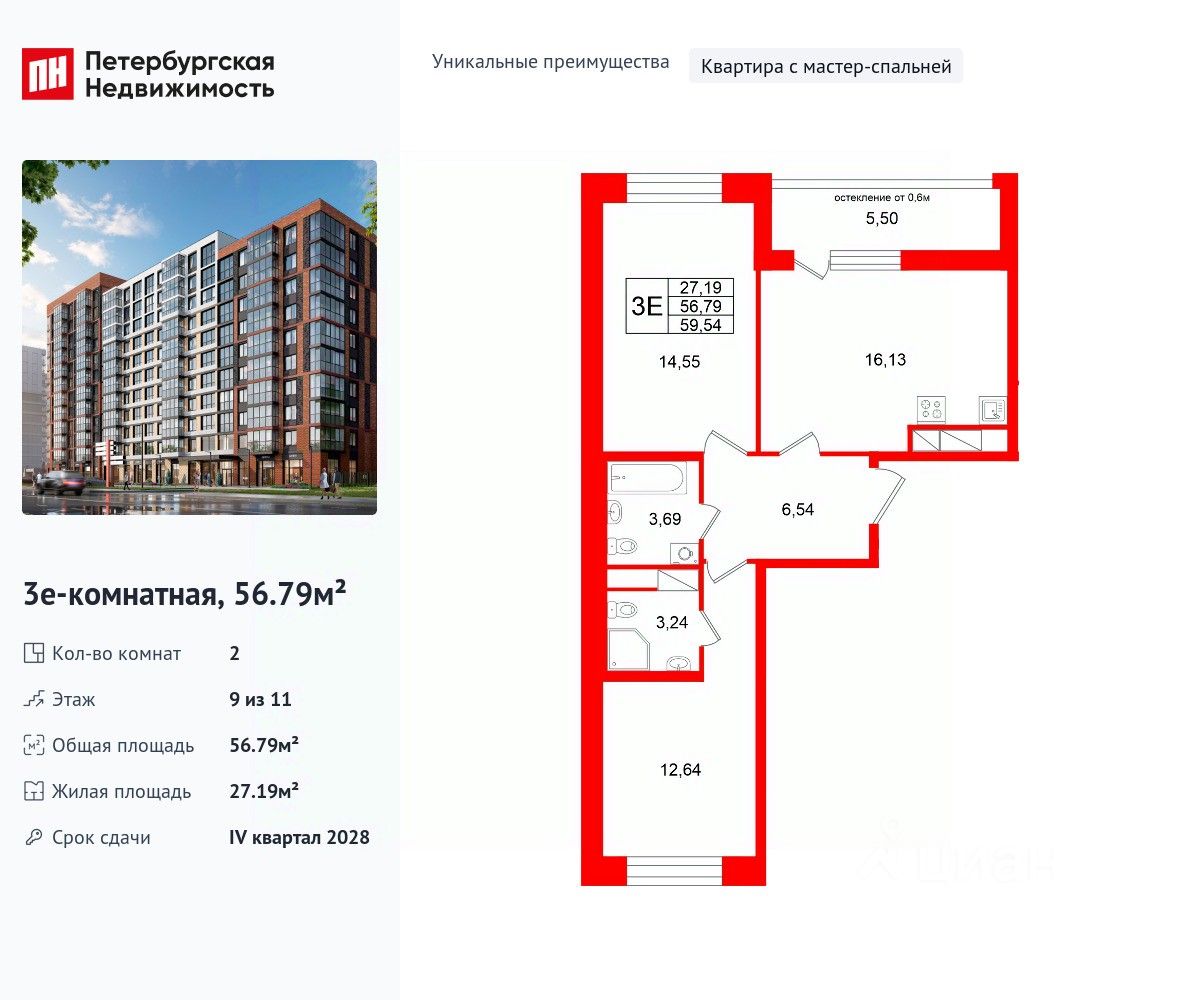 Уникальная, функциональная европланировка, большая кухня-гостиная 16.13 м², вместительная прихожая 6.54 м². Общая площадь квартиры - 56.79 м², жилая 27.19 м², высота потолка 2.77 м.
