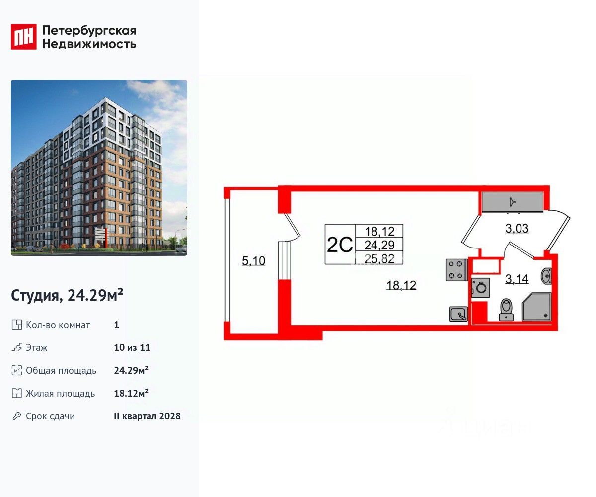 Удобная, классическая, функциональная европланировка, вместительная прихожая 3.03 м². Общая площадь студии - 24.29 м², жилая 18.12 м², высота потолка 2.77 м.