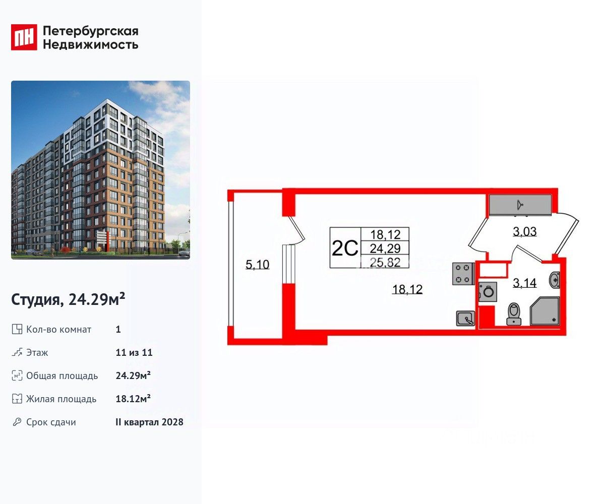 Удобная, классическая, функциональная европланировка, вместительная прихожая 3.03 м². Общая площадь студии - 24.29 м², жилая 18.12 м², высота потолка 3 м.