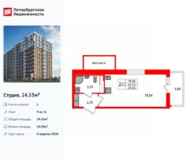 Удобная, классическая, функциональная европланировка, вместительная прихожая 2.75 м². Общая площадь студии - 24.53 м², жилая 18.04 м², высота потолка 2.77 м.