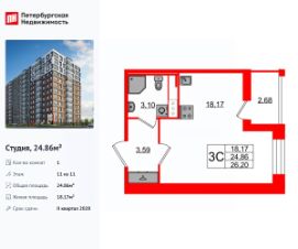 Удобная, классическая, функциональная европланировка, просторная прихожая 3.59 м². Общая площадь студии - 24.86 м², жилая 18.17 м², высота потолка 3 м.