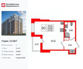 Удобная, классическая, функциональная европланировка, просторная прихожая 3.61 м². Общая площадь студии - 25.68 м², жилая 18.22 м², высота потолка 2.77 м.